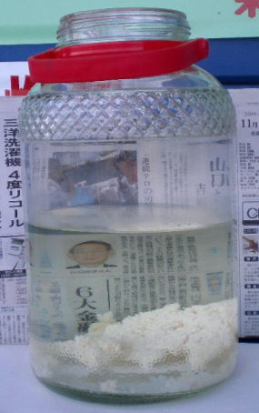 バイオディーゼル洗浄廃液 処理直後 時間がたてば水は透明になっていきます。 ノウハウやコツが必要です。 |