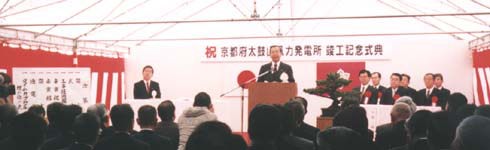 ![]() 風力発電竣工記念式典(京都府知事のご挨拶) 式典の最後にタイムカプセル埋め込み式 |